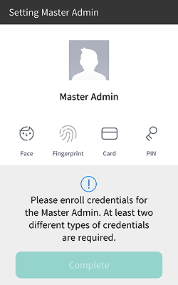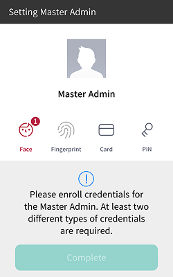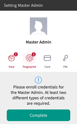 두 종류 이상의 크리덴셜을 등록한 후, Complete 버튼을 누르면 Master Admin 등록이 완료됩니다.