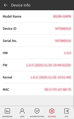SETTINGS → DEVICE → Device Info를 선택하세요. Model Name, Device ID, Serial No., HW, FW, Kernel, MAC 정보를 확인할 수 있습니다.