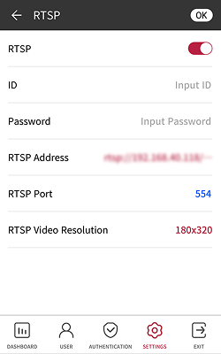 RTSP: RTSP 활성화 여부를 설정할 수 있습니다. RTSP 설정을 켜면 ID, Password, RTSP Address, RTSP Port, RTSP Video Resolution를 설정할 수 있습니다.