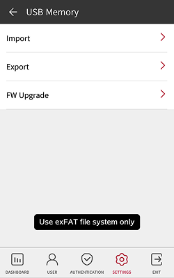 USB 메모리는 파일 시스템이 exFAT 형식인 제품을 사용할 것을 권장합니다. FAT32 형식인 USB 메모리를 사용하면 저장된 얼굴 데이터가 50,000개 이상일 경우 장치가 오작동할 수 있습니다.