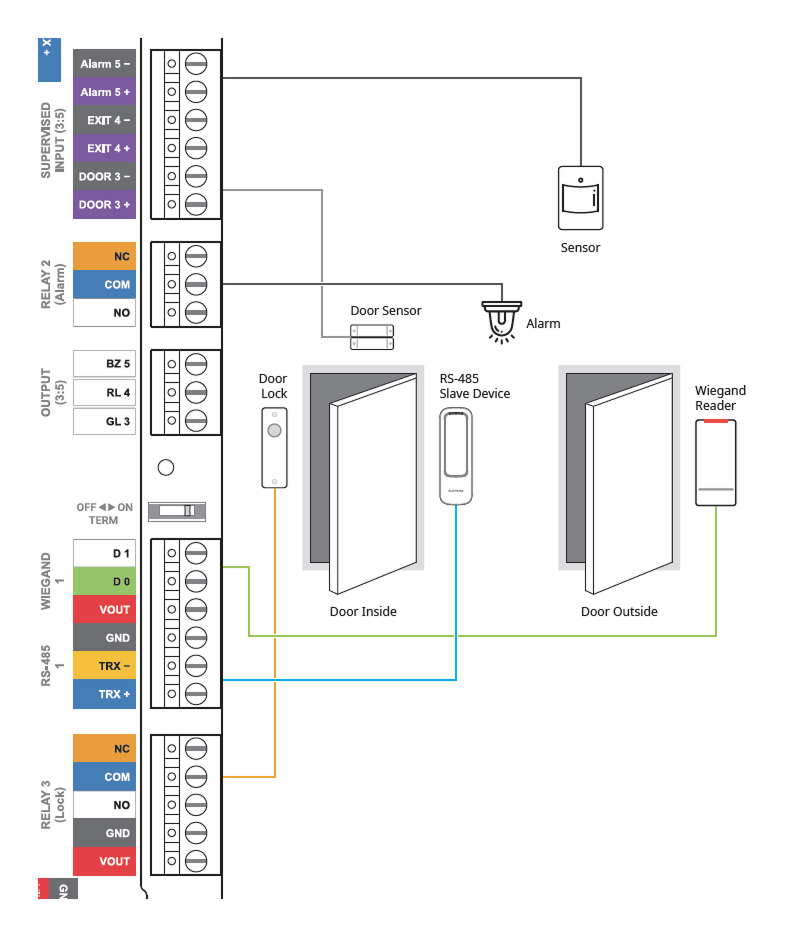 本製品は RS-485 ポートを 3 つサポートしており、Door Interface をデイジーチェーン接続すると最大 34 のドアを構成できます。