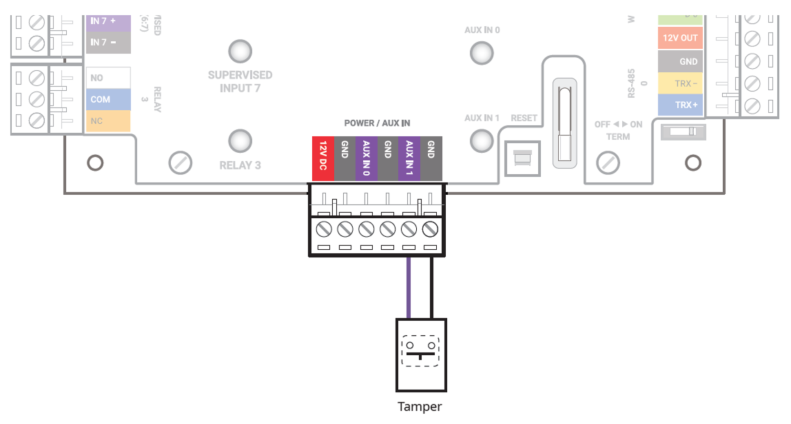 AUX IN端子に電源障害検出器またはタンパーを接続できます。