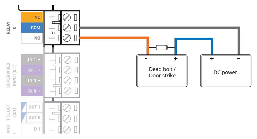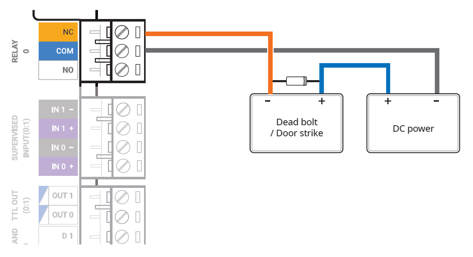 Fail Secure Lock を使用する場合は、下図のように NO リレーを接続してください。 Fail Secure Lock は通常、リレー回路に電流が流れず、リレーが動作して電流が流れると出入口が開きます。 停電や外部要因で装置の電源が切れた場合、出入口が施錠されます。