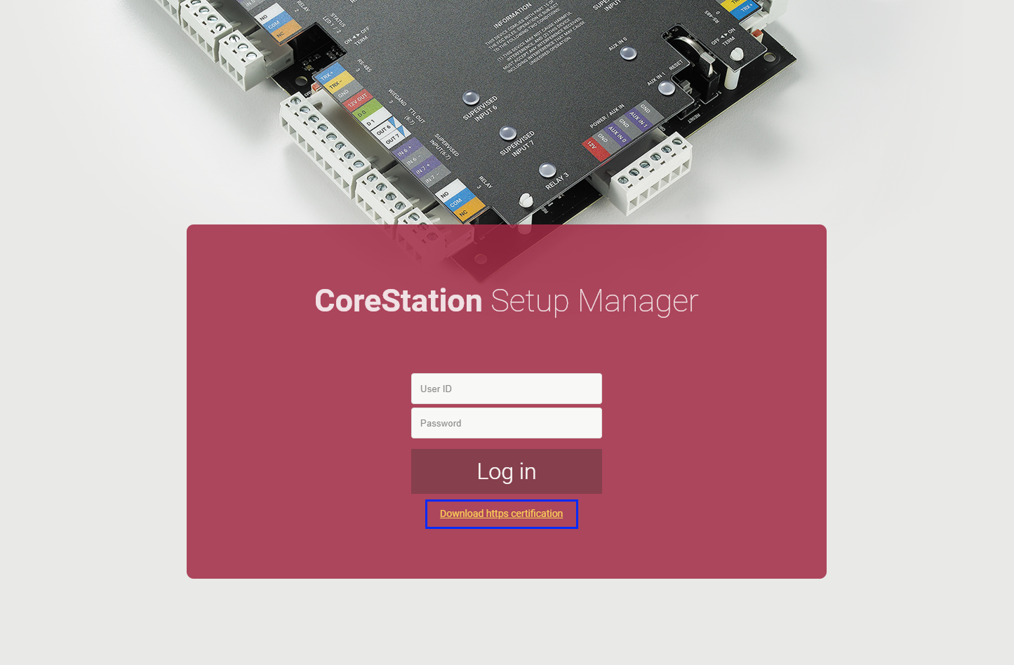 ログイン画面で Download https certification をクリックします。 CoreStation Setup Manager に初めて接続する場合、HTTPS を正しく使用するために証明書をインストールする必要があります。