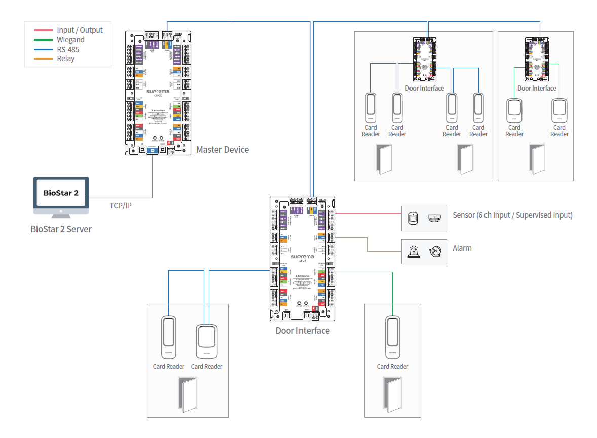 本製品はRS-485ポートを3つ搭載しており、マスター装置に複数のDoor Interfaceをデイジーチェーン接続することで、最大34ドアの構成が可能です。