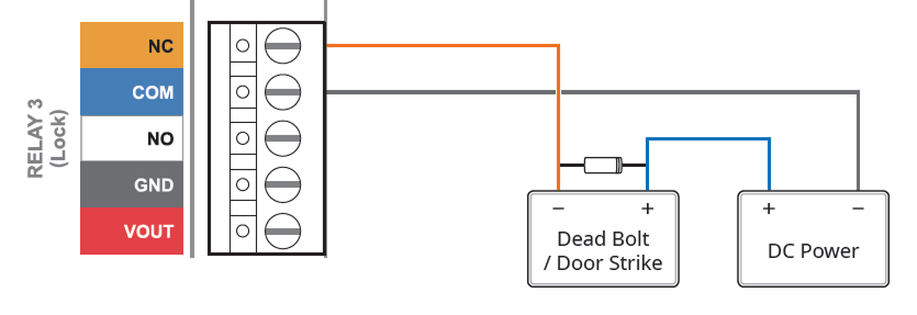 Fail Secure Lock を使用する場合は、下図のように NO リレーを接続してください。 Fail Secure Lock は通常、リレー回路に電流が流れず、リレーが動作して電流が流れると出入口が開きます。 停電や外部要因で装置の電源が切れた場合、出入口が施錠されます。