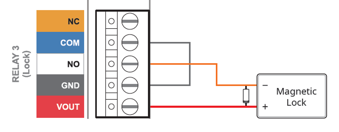 マグネティックロックを使用する場合は、下図のようにロックの電源を Lock 端子の GND、VOUT に直接接続してください。
