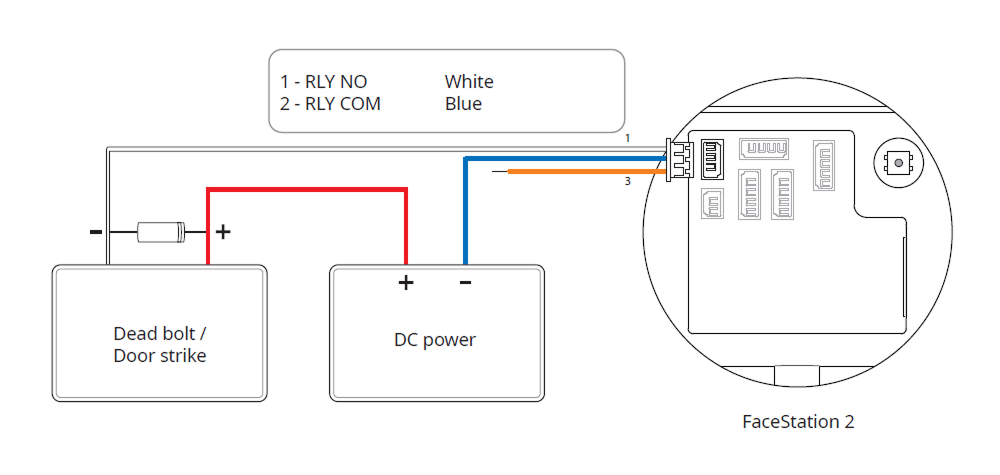 フェイルセキュアロックを使用するには、下図のように N/O リレーを接続してください。 Fail Secure Lock は通常、リレー回路に電流が流れず、リレーが動作して電流が流れると出入口が開きます。 停電や外部要因で装置の電源が切れた場合、出入口が施錠されます。