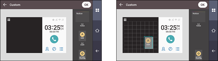 Home Screen:ホーム画面の背景に表示する項目を選択できます。 スタイルで「ユーザー定義」を選択すると、ホーム画面をユーザーが直接編集できます。 編集したいオブジェクトを長押ししてドラッグ&ドロップし、ホーム画面を編集してください。
