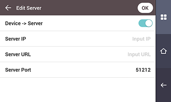 Device → Server:デバイスから入力した情報を持つサーバーに直接接続信号を送信できます。 Device → Server設定をオンにすると、Server IP, Server URL, Server Portをユーザーが入力できます。