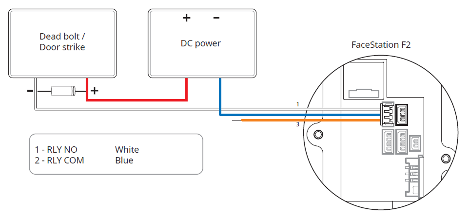 フェイルセキュアロックを使用するには、下図のように N/O リレーを接続してください。 Fail Secure Lock は通常、リレー回路に電流が流れず、リレーが動作して電流が流れると出入口が開きます。 停電や外部要因で装置の電源が切れた場合、出入口が施錠されます。