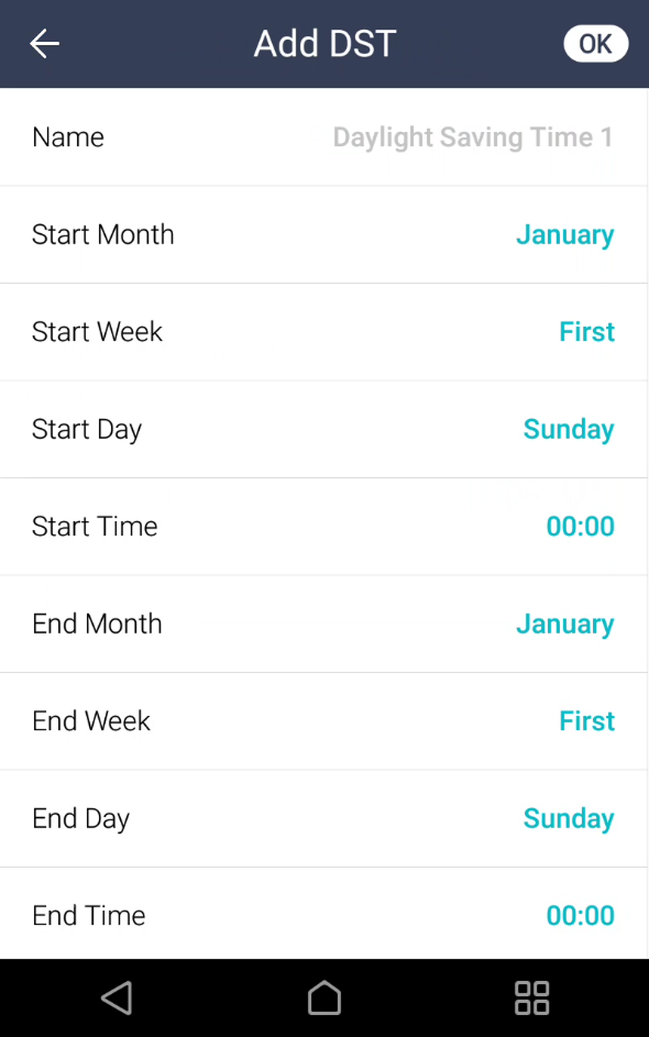 デバイスで夏時間(DST)を適用できます。 開始日時と終了日時を適切に設定してください。