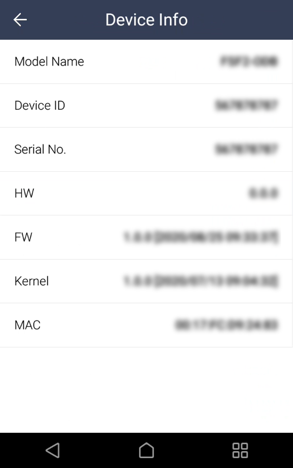 DEVICE → Device Infoを選択してください。 Model Name、Device ID、Serial No.、HW、FW、Kernel、MAC の情報を確認できます。