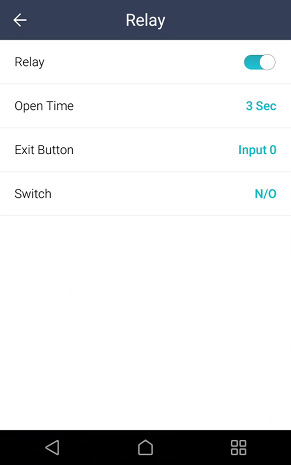 Relay:リレーの有効化を設定できます。 リレー設定をオンにすると、Open TimeとExit Buttonを設定できます。