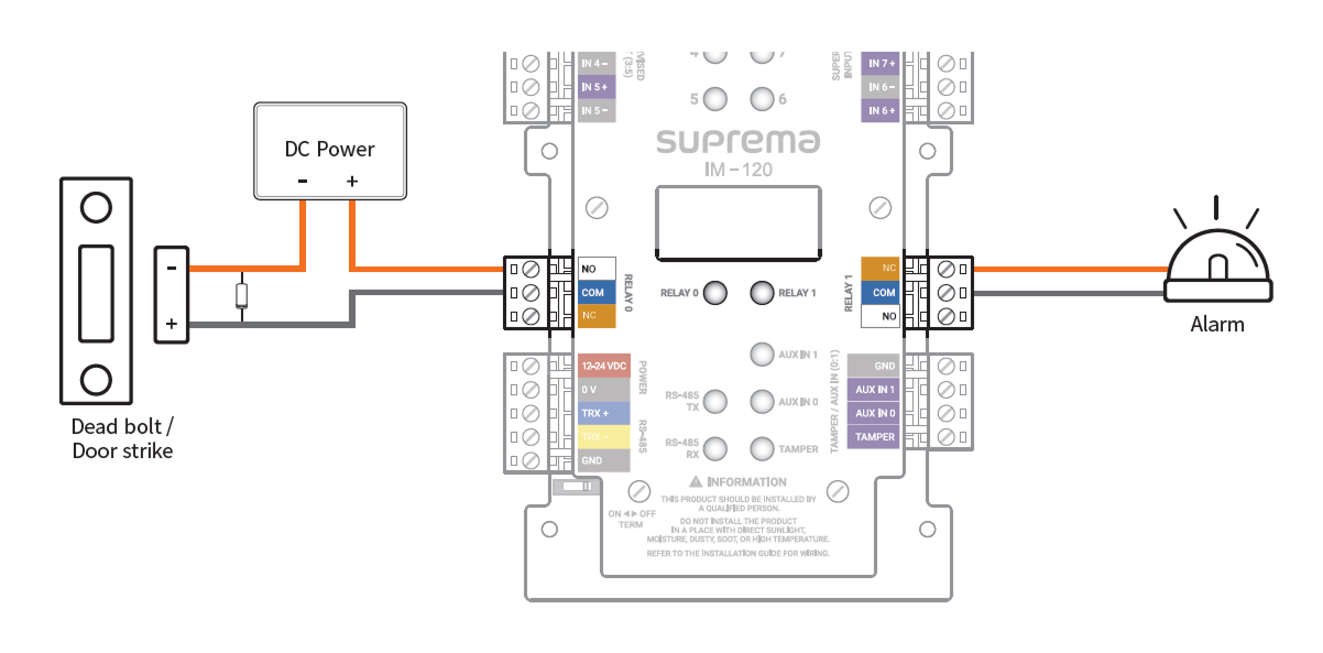 Fail Secure Lock を使用する場合は、下図のように NO リレーを接続してください。 Fail Secure Lock は通常、リレー回路に電流が流れず、リレーが動作して電流が流れると出入口が開きます。 停電や外部要因で装置の電源が切れた場合、出入口が施錠されます。