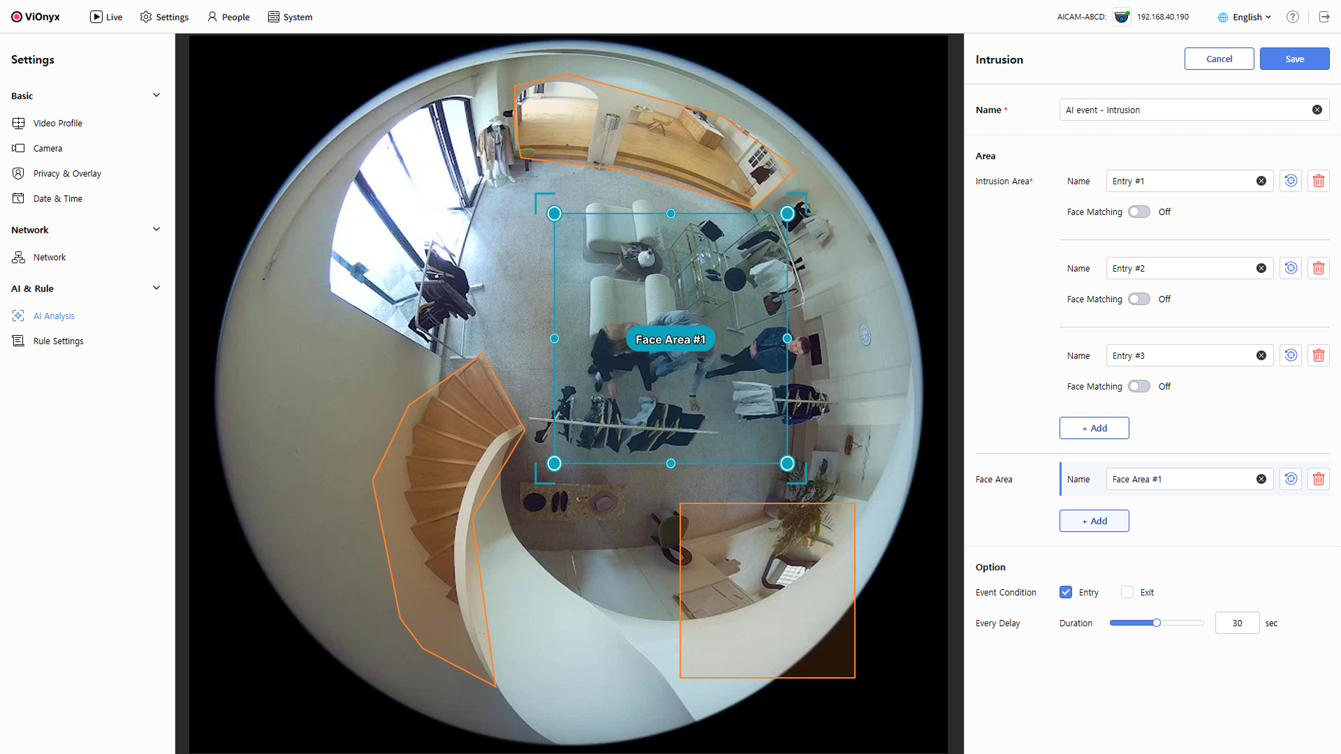 • Face Matching: 침입 영역에서 감지되는 사람의 신원을 자동으로 확인하려면 On으로 설정하세요.