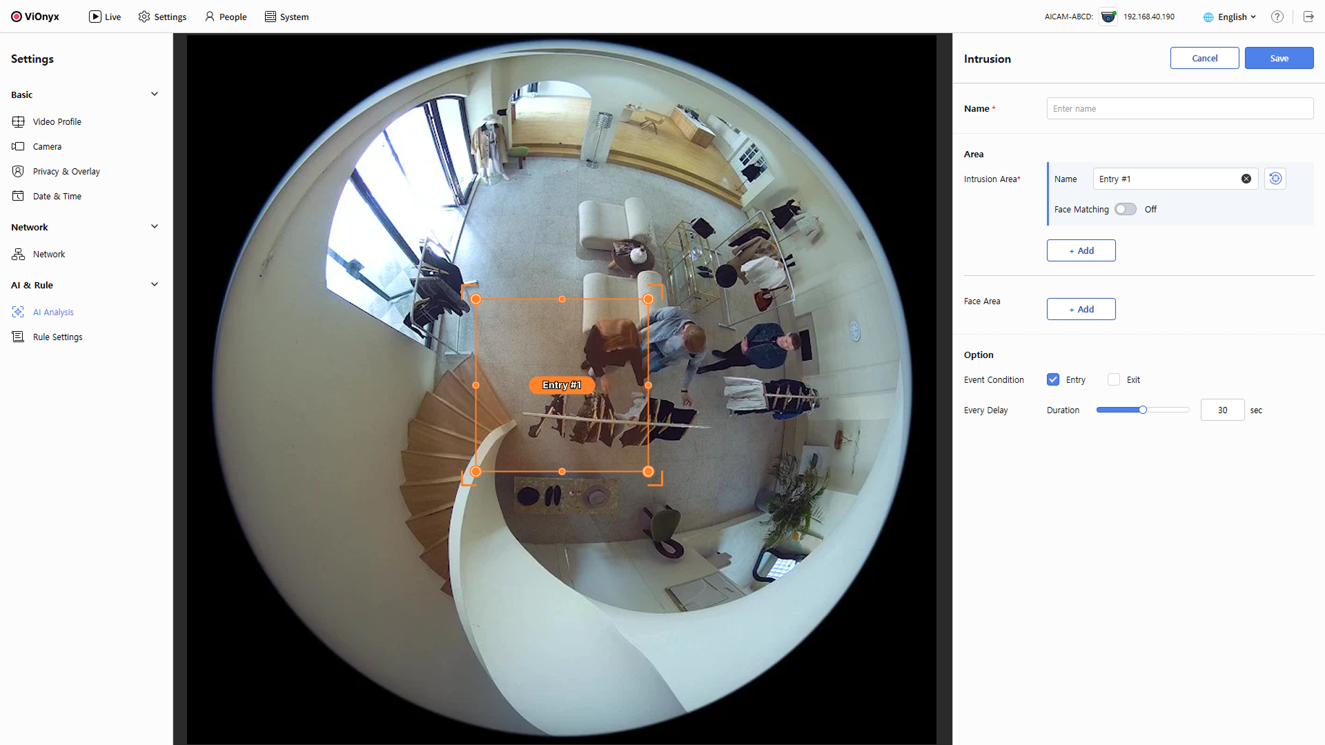 침입 감지 이벤트를 생성하면 Live 메뉴에서 특정 구역에 사람이 침입하는 것을 감지하여 이벤트를 발생시킬 수 있습니다. 또한 얼굴 영역을 설정하면 해당 영역에서 얼굴을 우선적으로 추적할 수 있으며, 등록된 사용자는 신원을 자동 인식합니다.