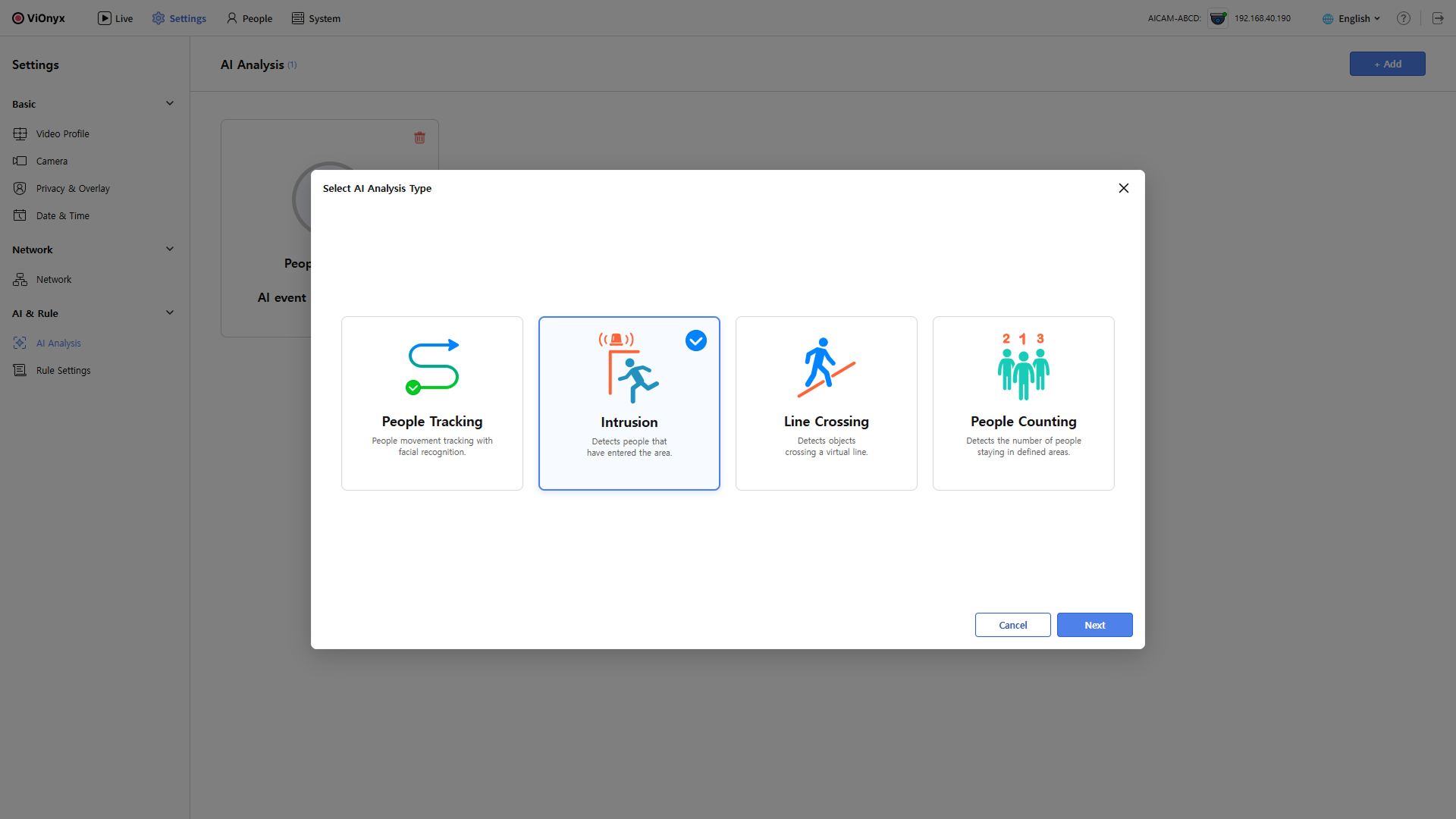 4. Select AI Analysis Type 창에서 Intrusion를 선택하고 Next 버튼을 클릭하세요.