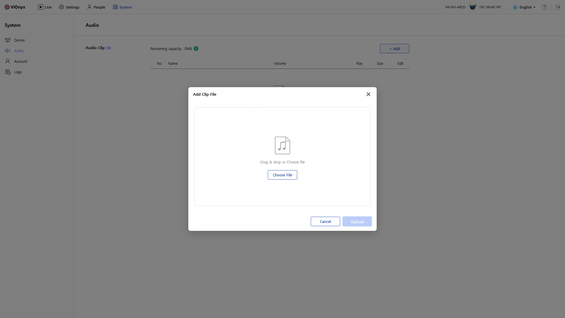 카메라에서 사용할 오디오 클립을 업로드하여 경보음이나 안내음으로 활용할 수 있습니다. WAV 형식의 오디오 파일을 업로드하고 관리할 수 있습니다.