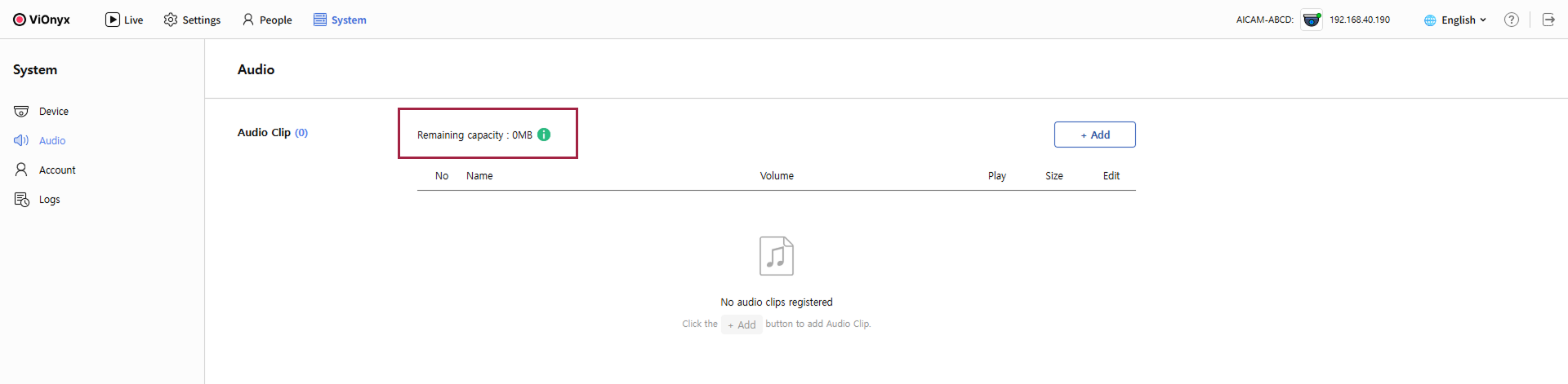 Audio Clip 섹션에서 오디오 저장소의 잔여 용량을 확인할 수 있습니다.