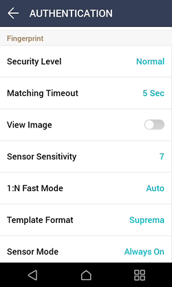 Template Format:指紋テンプレート形式を設定できます。 SUPREMAがデフォルトで設定されています。テンプレート形式を変更すると、以前に保存されたすべての指紋が使用できなくなるため、変更時は注意してください。