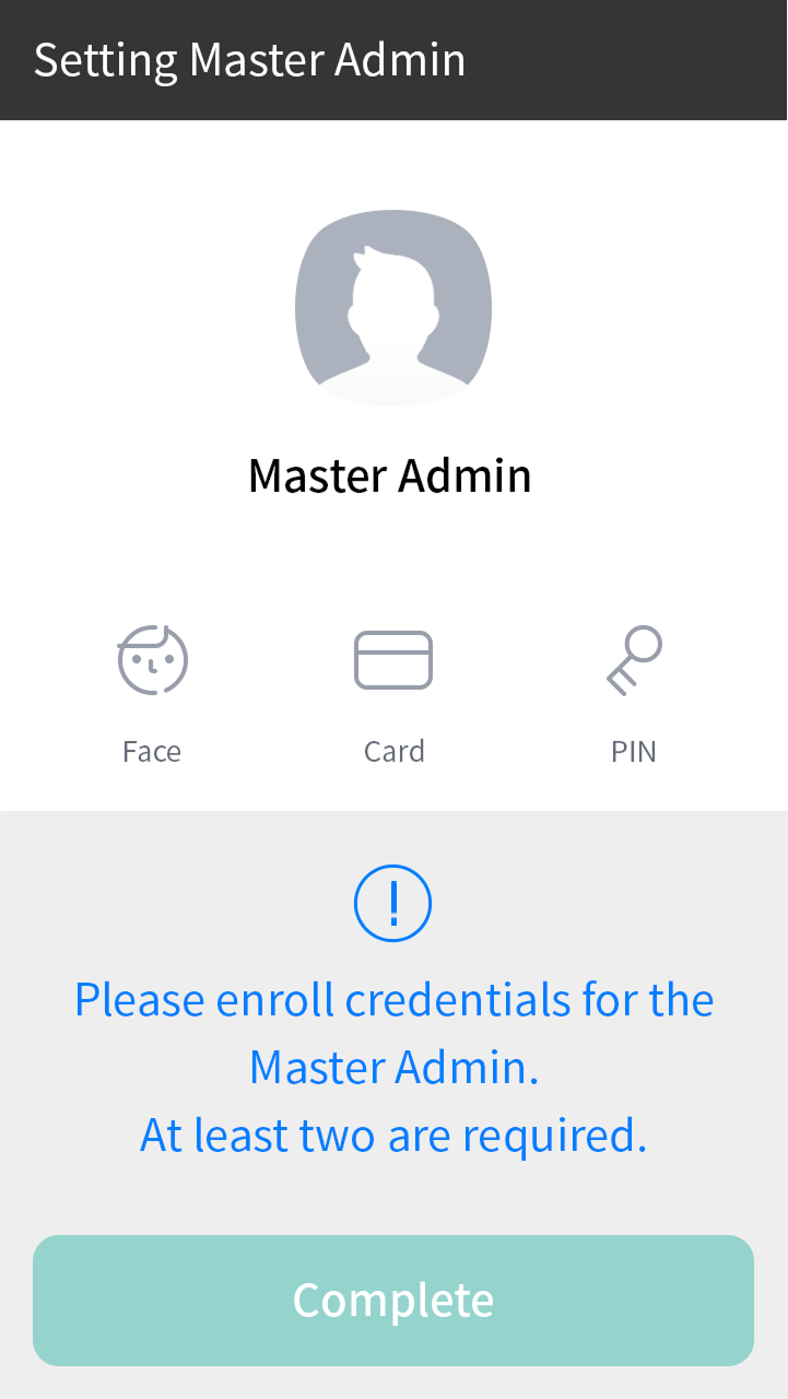 新しいデバイスでは、最初にマスター管理者を必ず登録する必要があり、登録しない場合はデバイスの使用が制限されます。