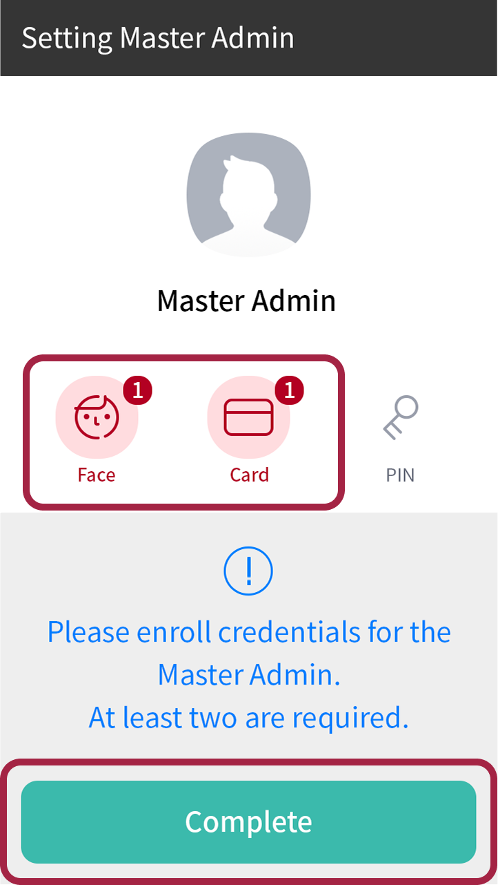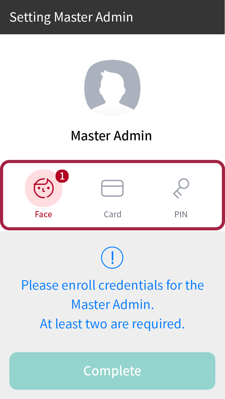 マスター管理者を登録するには、少なくとも 2 種類以上のクレデンシャルを登録する必要があります。 必要な2種類のクレデンシャルを選択して登録してください。