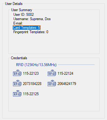 After the card has been registered, you can see or delete the credential by double clicking the Card Templates under User Summary: