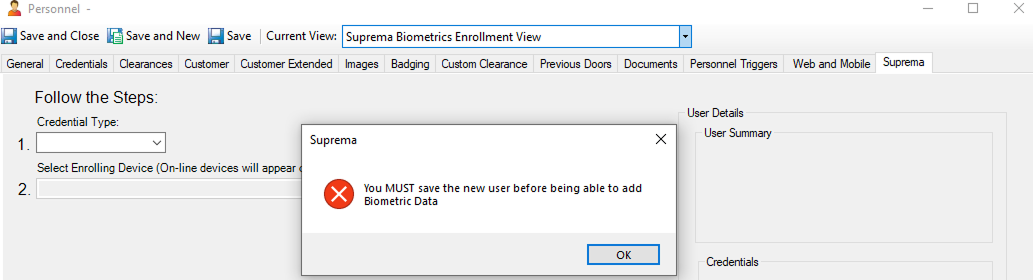 When the user is new, and it has not been saved to C•CURE 9000 yet: you will see this notice asking you to save the user before in order to enroll Biometric data.