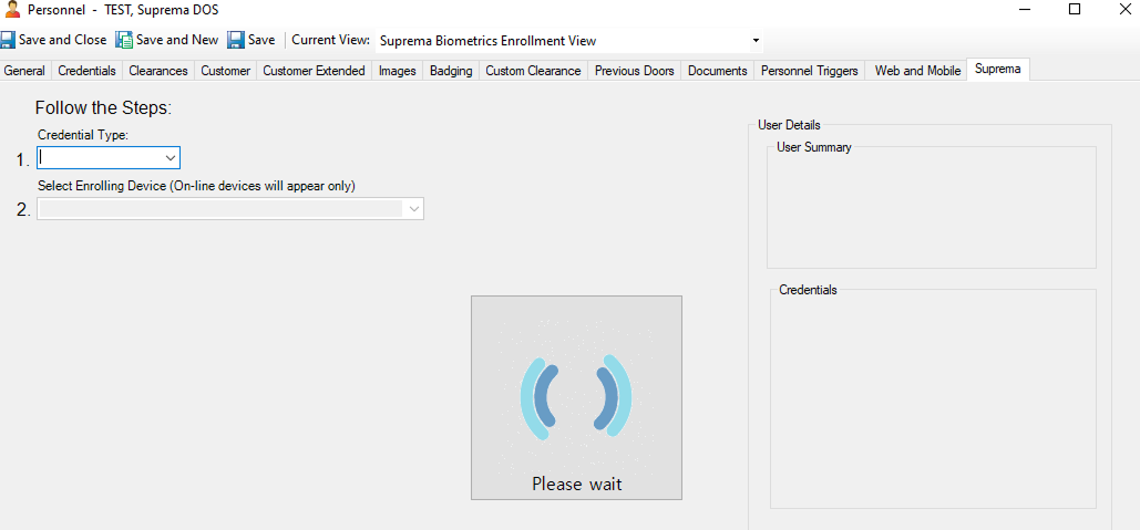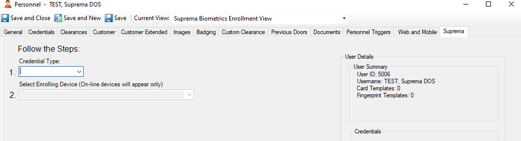 Once you are in the Personnel View, please make sure you are in the Suprema Biometrics Enrollment View as shown below.