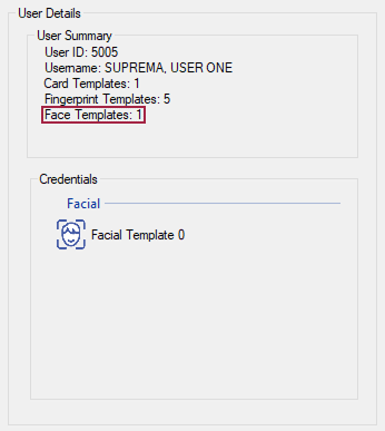 After the Face has been registered, you can see or delete the credential by double clicking the Facial Templates under User Summary: