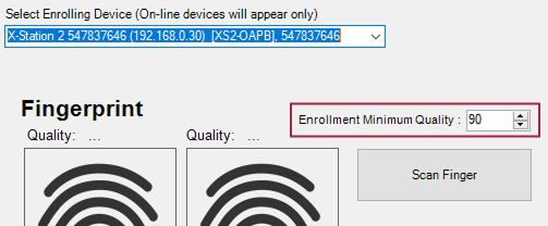 The Enrollment Minimum Quality ensures that the Finger is good enough to differentiate a person from another. The value of 90 or higher is preferred for a better authentication, however, if you encounter a problem with a person recognizing their fingerprint you can lower the value a bit.