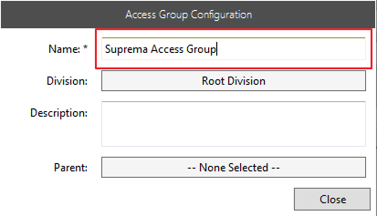 After clicking New Access Group button, a pop-up will be opened as shown below image set the Name as Suprema Access Group and click on the Close button then a pop-up will be closed.
