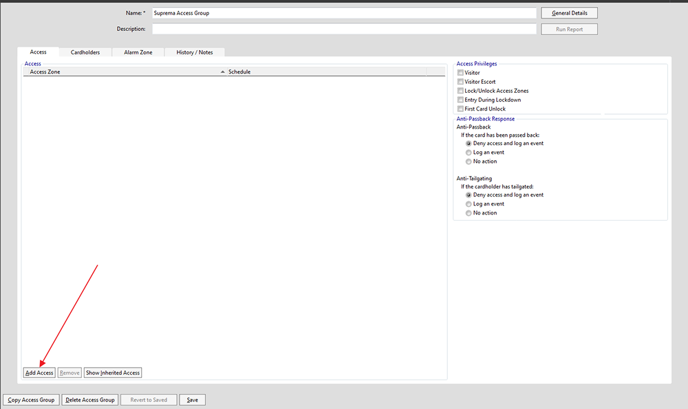 Open the Access Zone Properties that we have created in the General Setting. Then set the name as Suprema Access Zone.