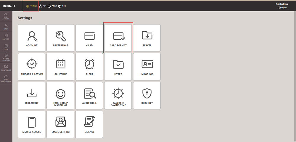 Fill in your BioStar 2 credentials to log in, go to the setting page, and select Card Format.