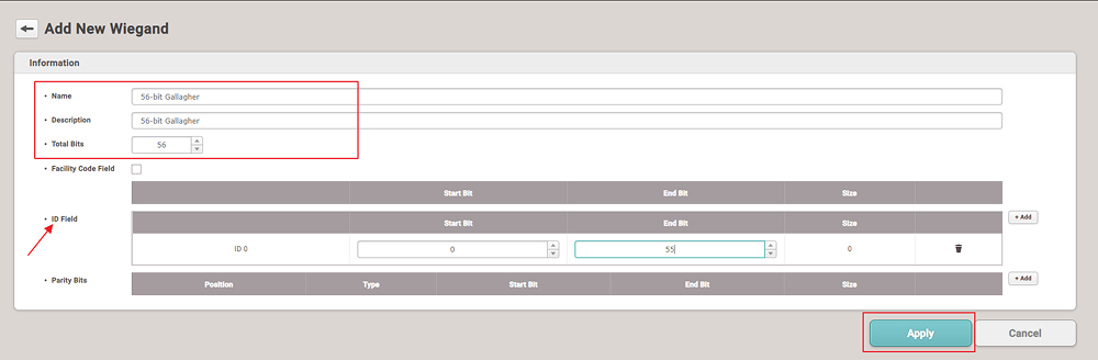 Set name as 56-bit Gallagher total bits as 56 and in ID field press add set start bit as 0 and end bit as 55.