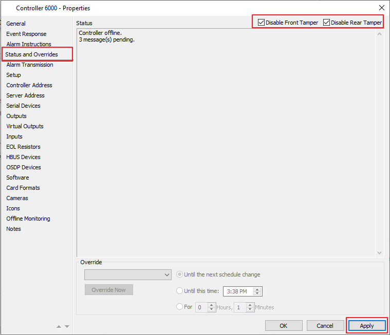 In the Status and Overrides options tick both checkboxes Disable Front Tamper and DisableRear Tamper.