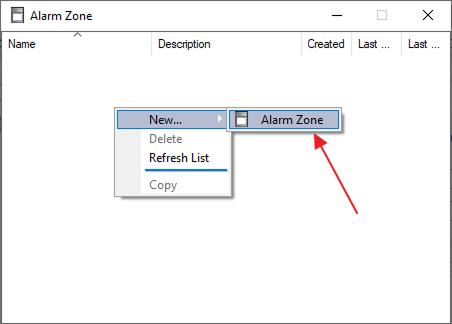 Then go back to Gallagher Configuration Client and go to configure → Alarm Zones and press right-click to create a new alarm zone.