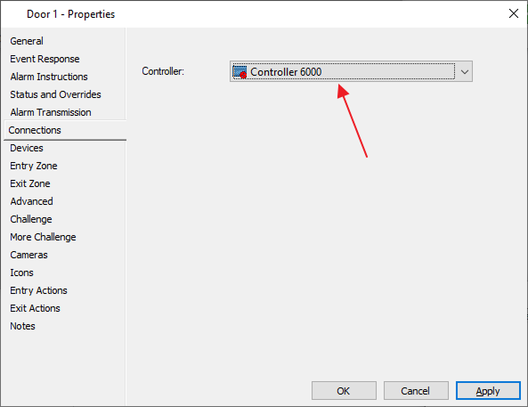 Now go to System Alarm Zone Properties and select Connections and in the controller dropdown choose Controller 6000. Press the OK button and close the Alarm Zone window.