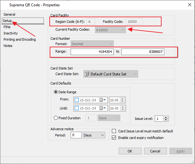 In Card type properties go to setup option Region code as A and Facility code as 10000 card number range as 4194304 to 8388607 and enable card expiry notification. Press OK.