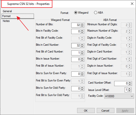 Create a second card format as Suprema CSN 32 bits, and in the format set as shown below.