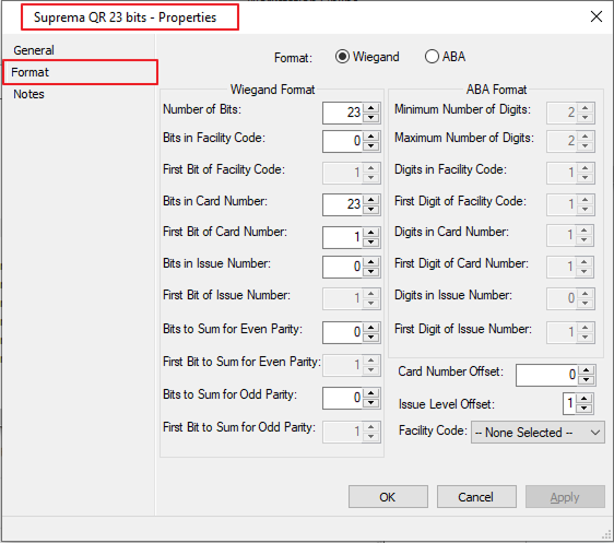 Create a sixth card format as Suprema QR 23 bits, and in the format set as shown below.