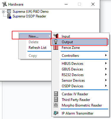 To create an OSDP connection; right-click on the Hardware window. Select New → OSDP Device → Then click on OSDP Reader, to create OSDP Reader on Hardware.
