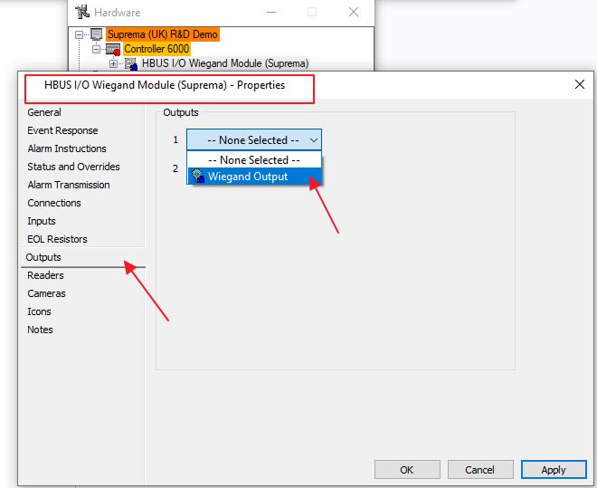 Now go to hardware window → double click on HBUS I/O Wiegand Module (Suprema) on the left side go to Outputs and select Wiegand Output press Apply and OK.