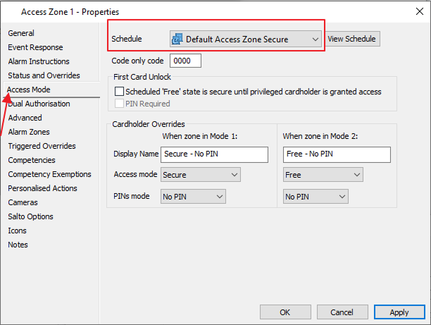 Go to Access Mode Tab Setting. Select Schedule as Default Access Zone Secure and press the OK button.