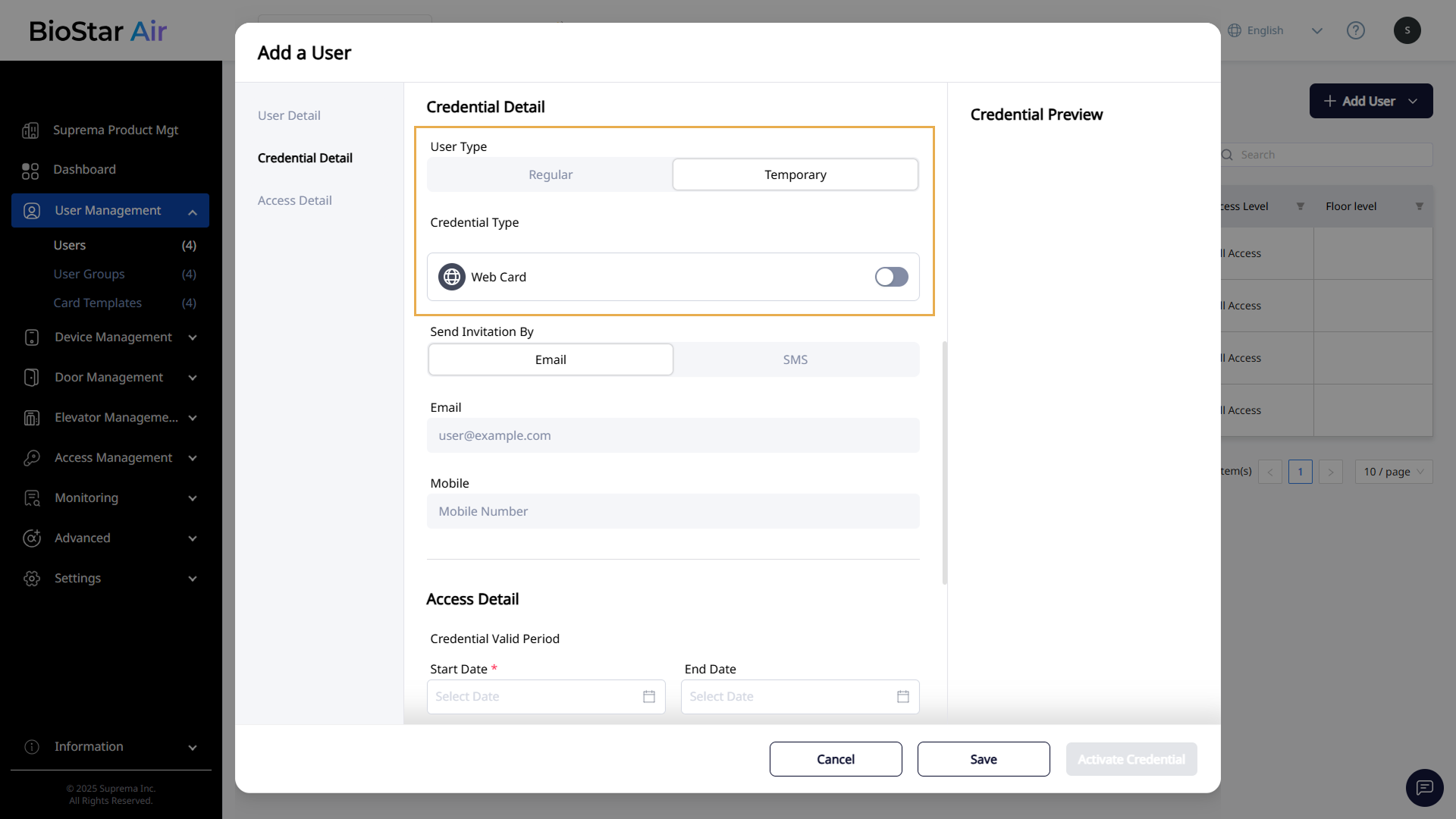 크리덴셜을 선택한 후 Access Detail 섹션에서 사용자의 크리덴셜 유효 기간, 출입 레벨 및 층 레벨 등을 구성하세요.