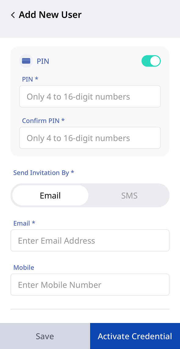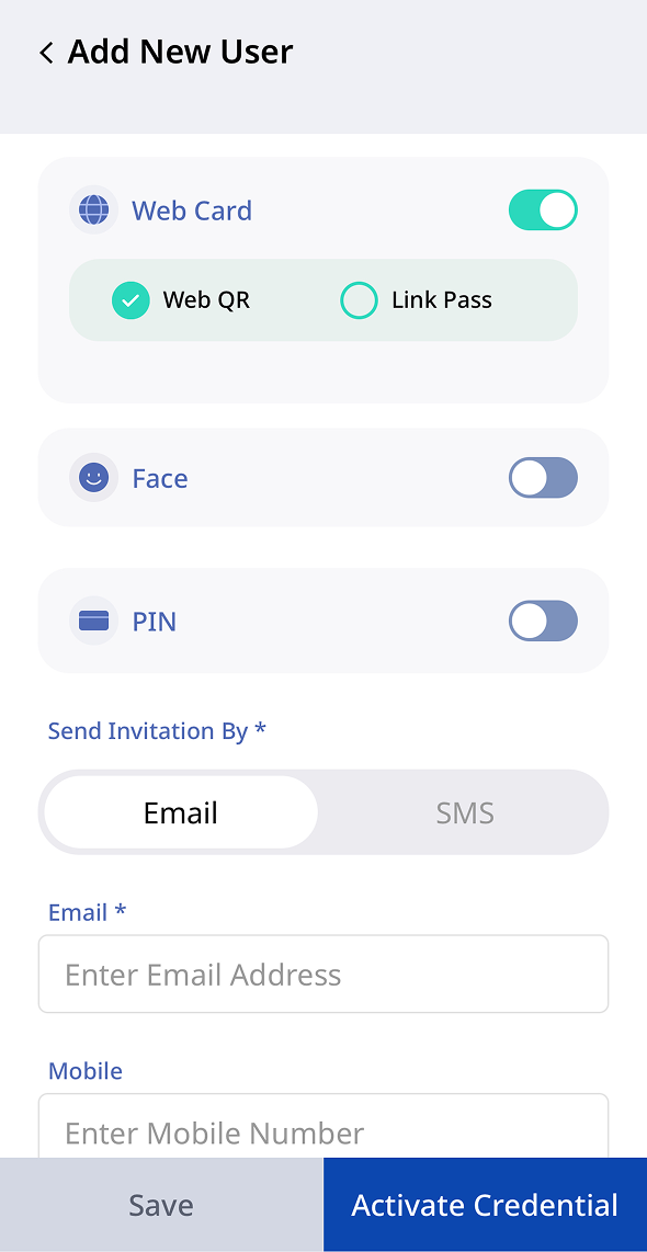 モバイルカード または ウェブカード を使用するユーザーに、Suprema Pass アプリのダウンロードリンクをメールで送信できます。 メールアドレス(必須)と携帯電話番号(任意)を入力してください。