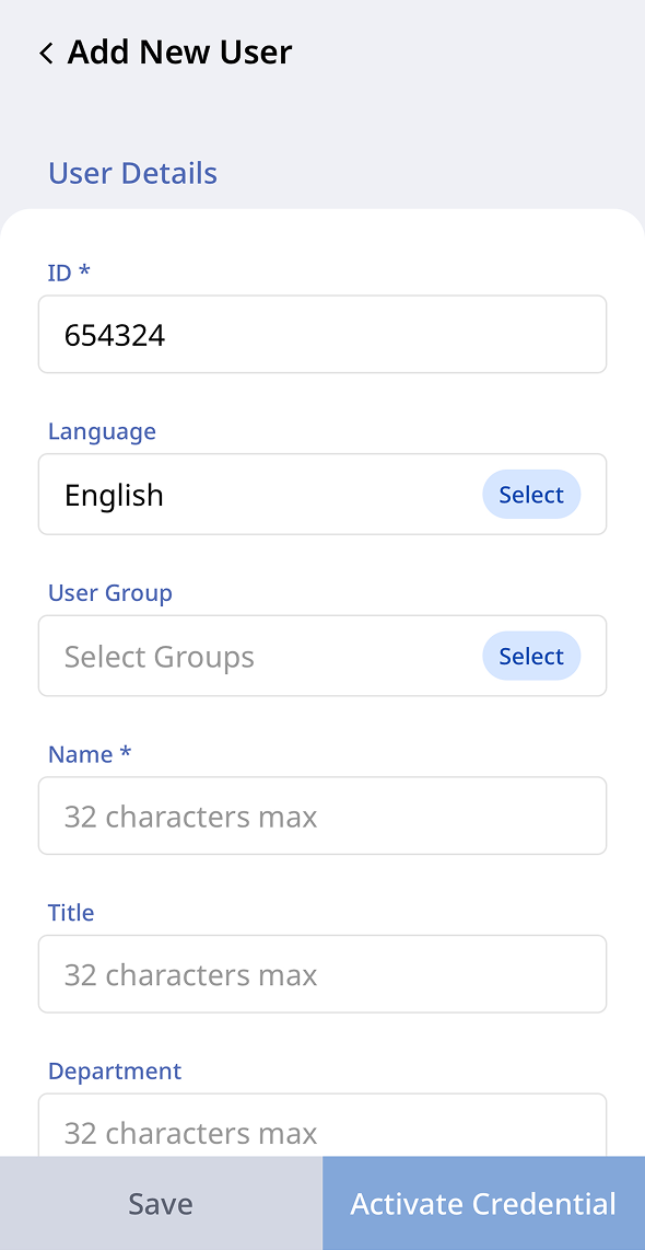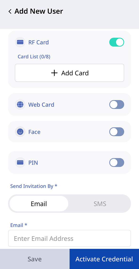 モバイルカード:Suprema Pass モバイルアプリをアクセス認証手段として使用できます。 管理者はカードID番号を編集できます。