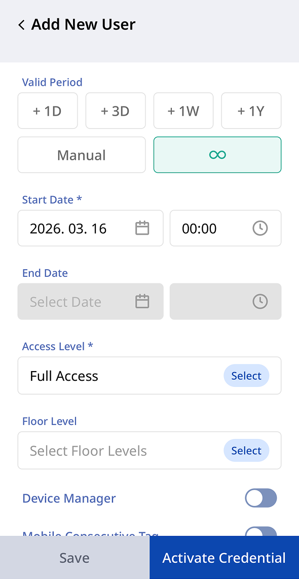 クレデンシャルを選択した後、アクセスの詳細 セクションでユーザーのクレデンシャル有効期間、アクセスレベルおよびフロアレベルなどを構成してください。