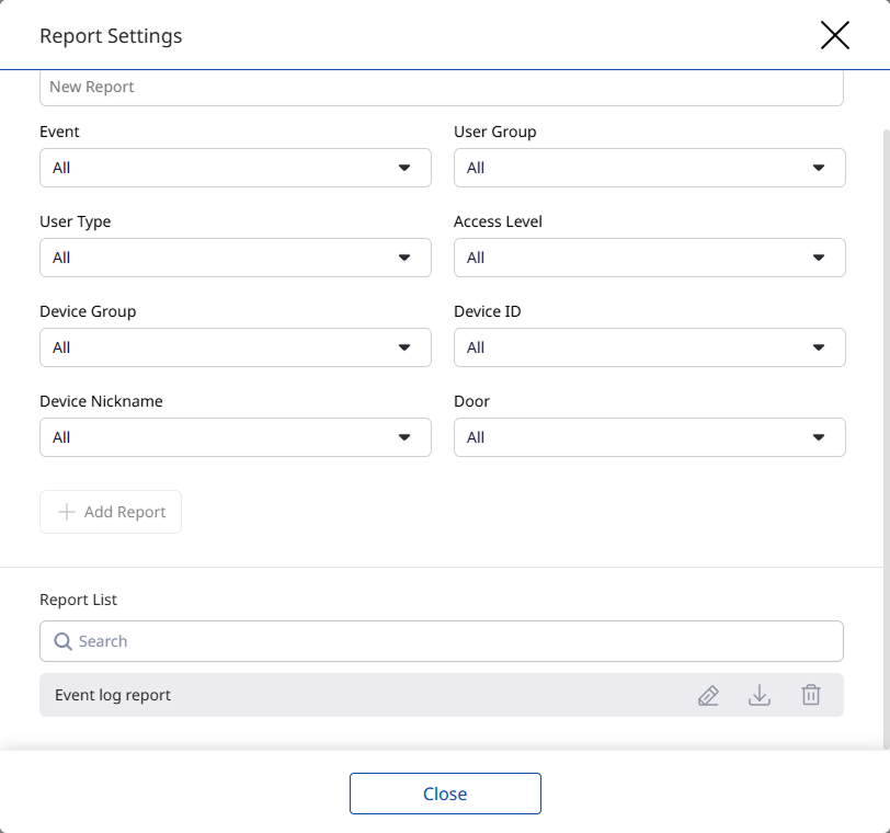 BioStar Air의 리포트는 리포트 유형에 따라 다양한 화면에서 구성할 수 있습니다. 이 문서에서는 사용자, 이벤트 로그 및 변경 로그에 대한 리포트를 생성하고 예약하는 방법을 안내합니다.